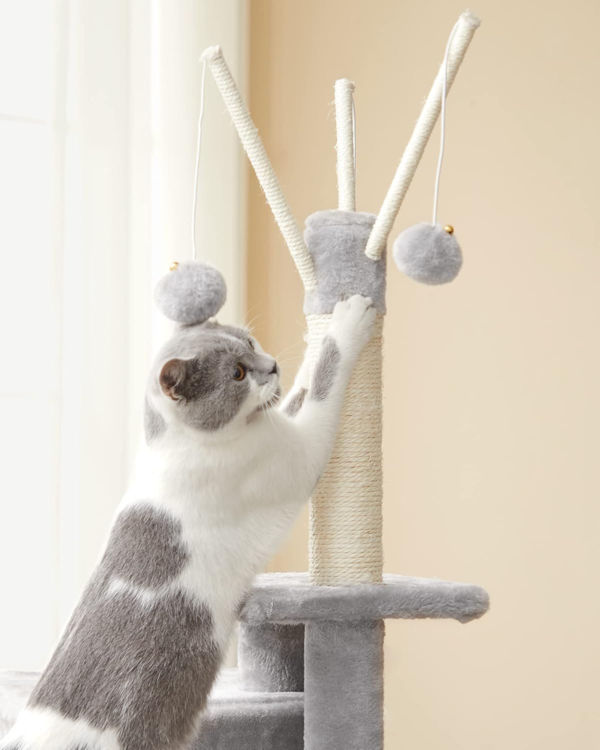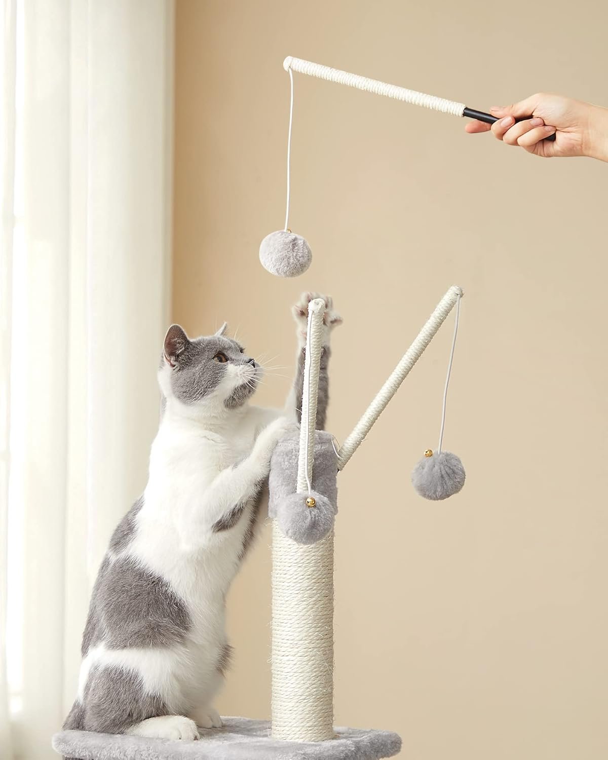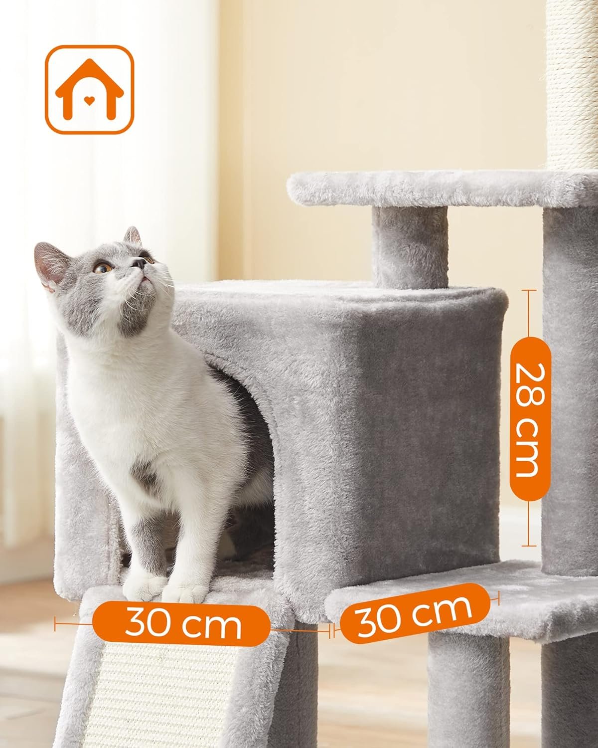 El árbol de gatos FEANDREA torre de juegos gatito gris claro está diseñado para cubrir las principales necesidades de los gatos de interior: rascado, descanso, observación y juego. Su estructura vertical permite aprovechar el espacio en el hogar mientras ofrece al gato diferentes alturas desde las que explorar su entorno y sentirse seguro.
