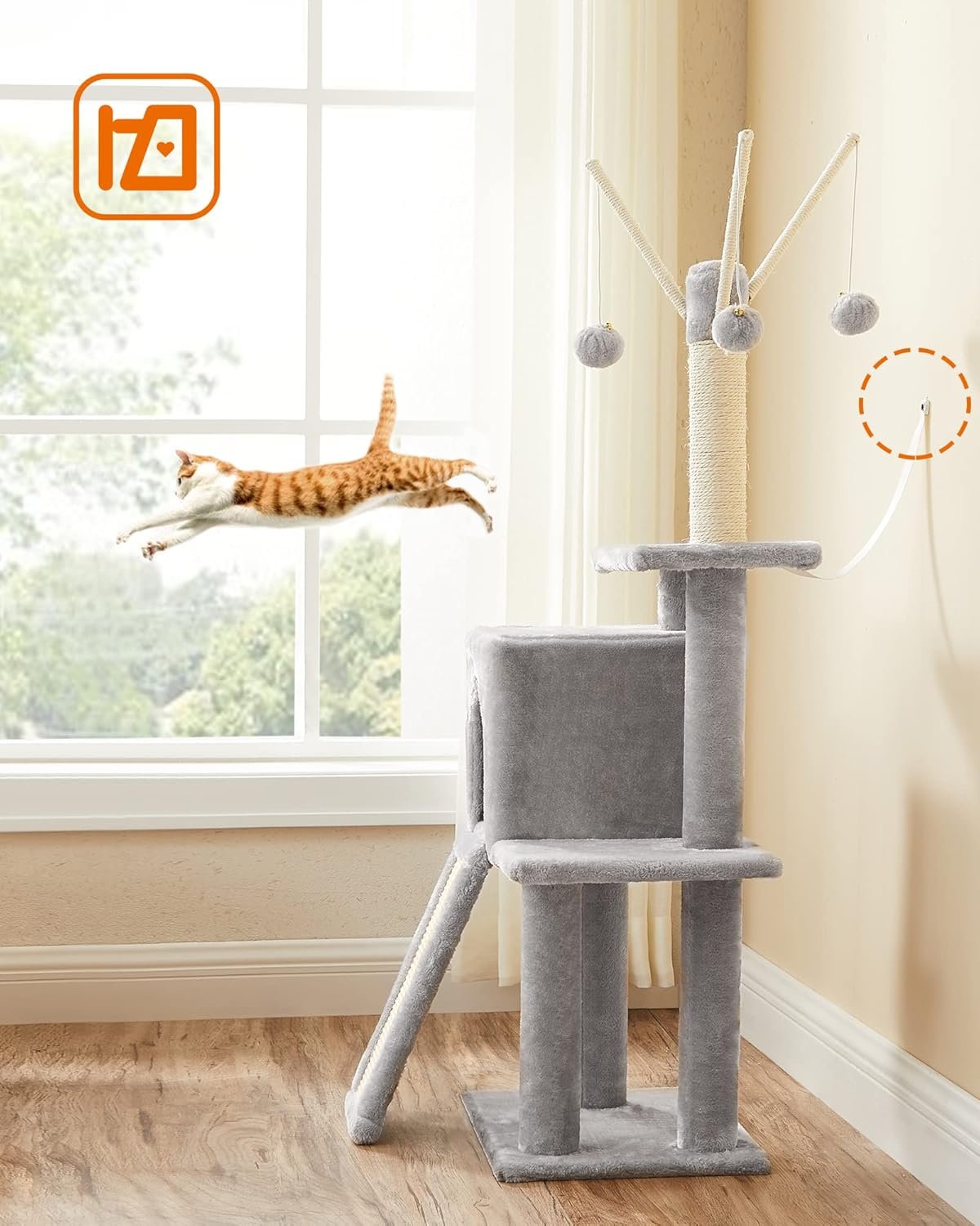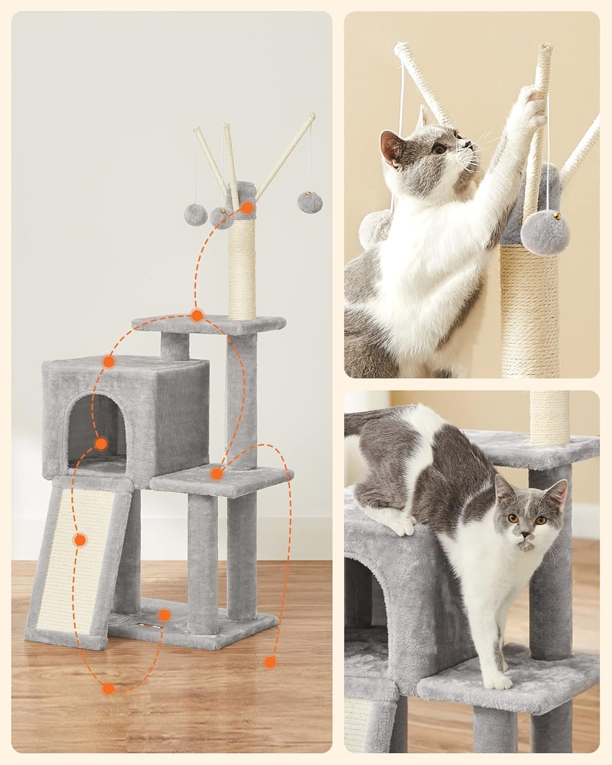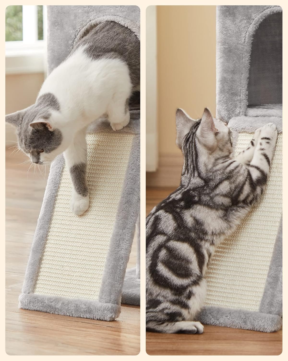 El árbol de gatos FEANDREA torre de juegos gatito gris claro está diseñado para cubrir las principales necesidades de los gatos de interior: rascado, descanso, observación y juego. Su estructura vertical permite aprovechar el espacio en el hogar mientras ofrece al gato diferentes alturas desde las que explorar su entorno y sentirse seguro.
