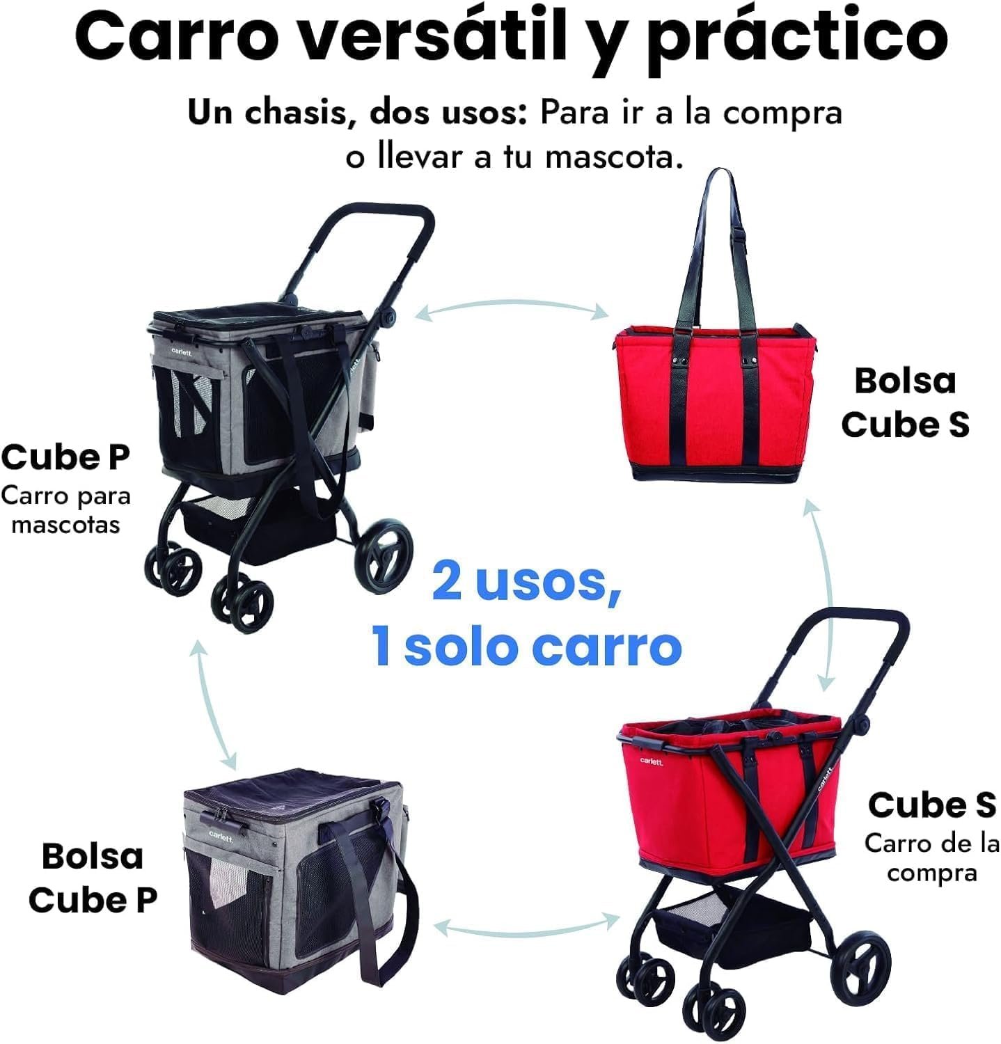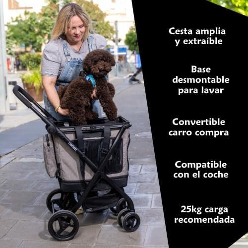 El Carrito de Transporte 3 en 1 Cube P es un sistema multifuncional que combina carrito con ruedas, transportín de mano y base compatible con el coche. Está diseñado para facilitar los paseos, desplazamientos urbanos y viajes con tu mascota, reduciendo el esfuerzo físico del dueño y aumentando la comodidad del animal.