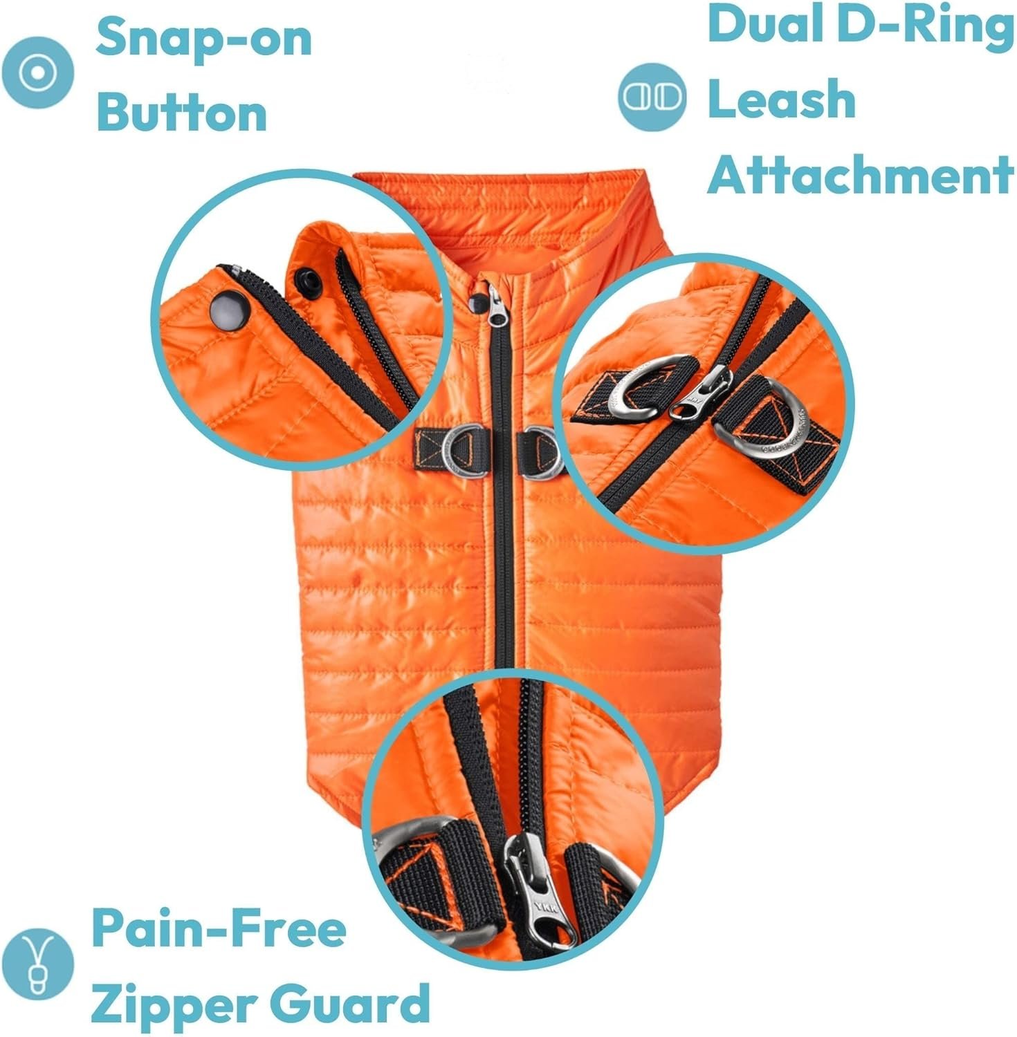 Chaleco acolchado ultraligero para perros, diseñado para proteger del viento y el frío moderado sin añadir peso. Cuenta con cremallera frontal, tejido resistente al agua y doble anilla en D para enganchar la correa. Ideal para perros pequeños y medianos en paseos diarios.