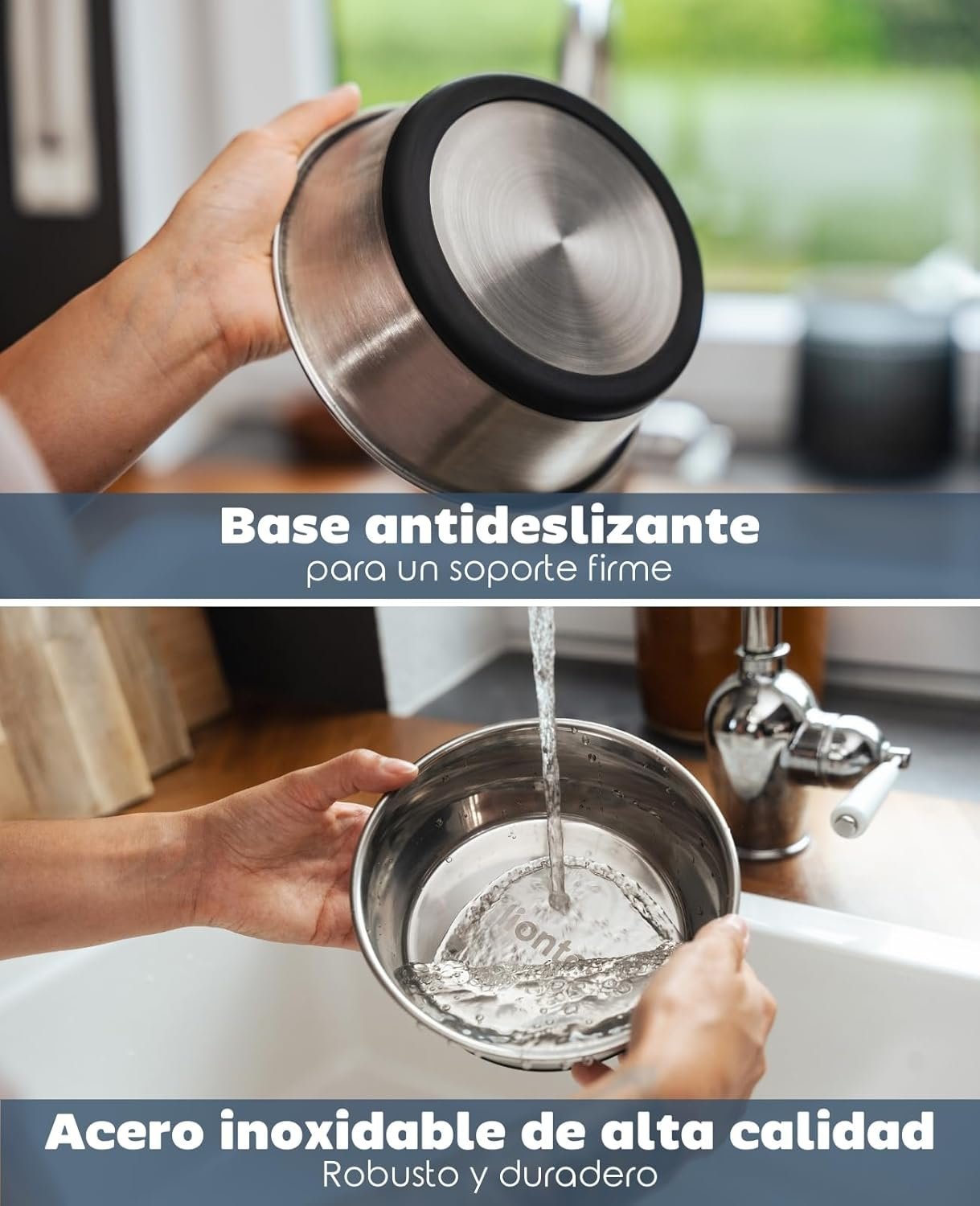 Material inoxidable, base antideslizante de silicona, capacidad equilibrada y facilidad de limpieza.