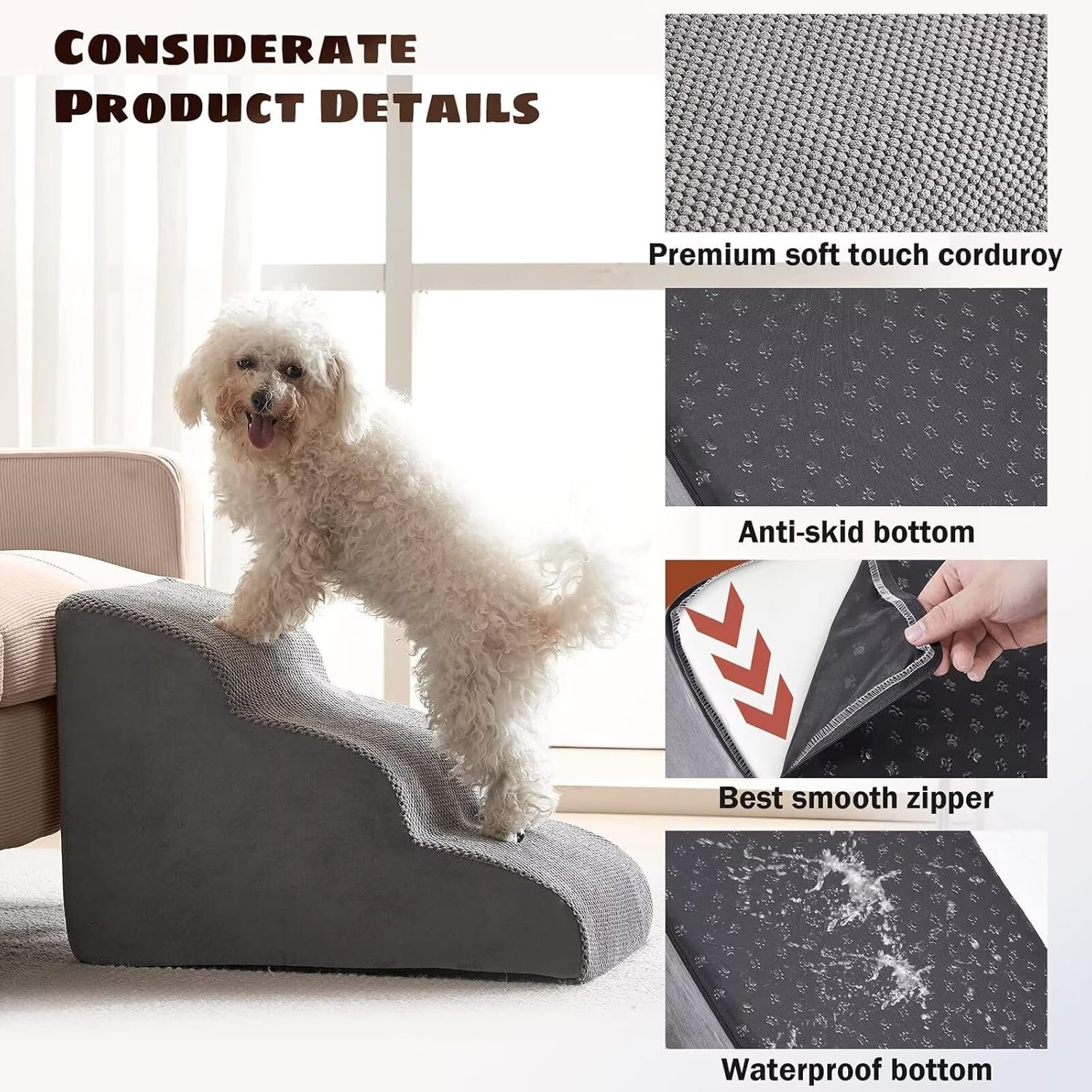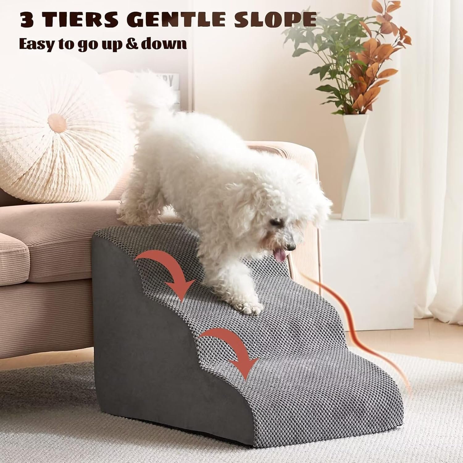 Coloca los escalones junto a la cama o sofá, asegurándote de que la base quede firme sobre el suelo. Permite que la mascota se adapte de forma progresiva y refuerza con calma hasta que lo use con naturalidad.