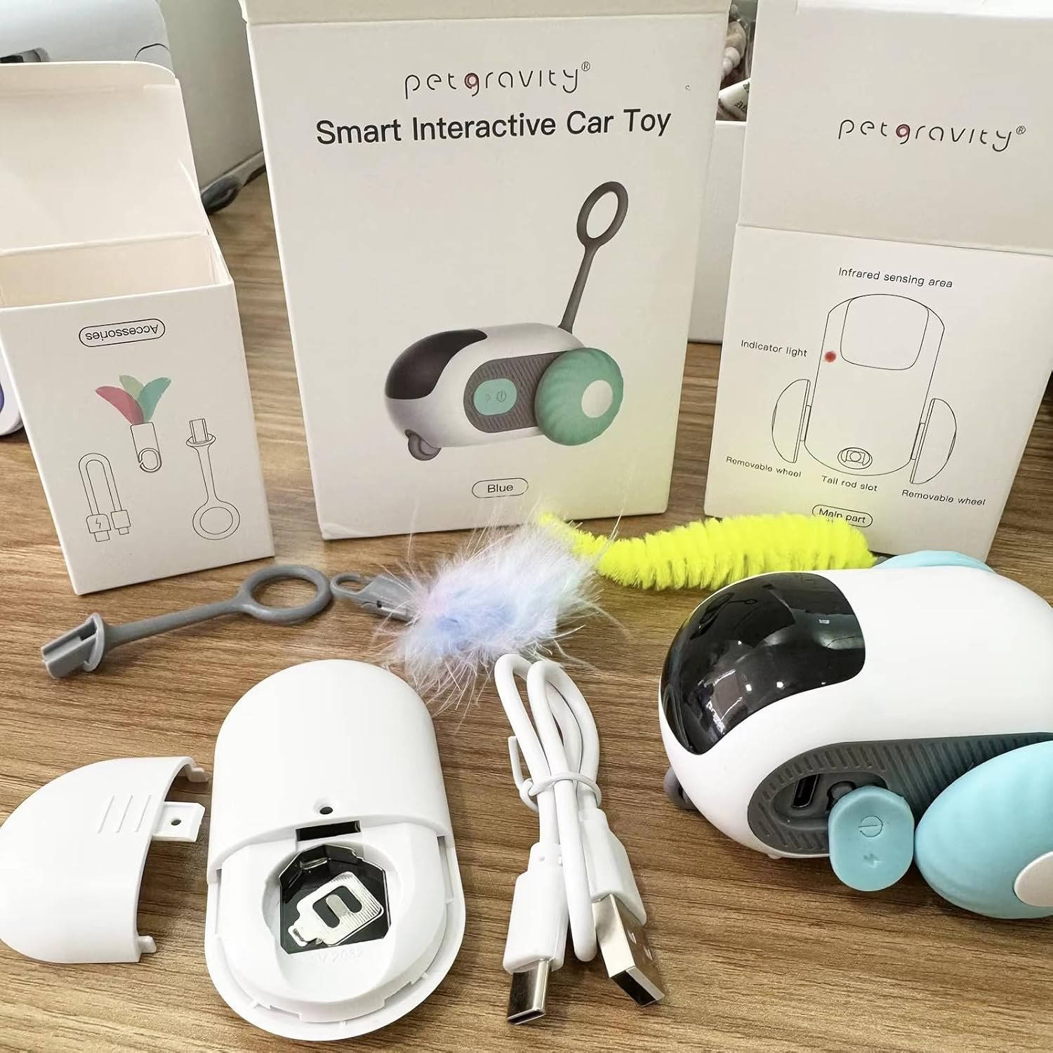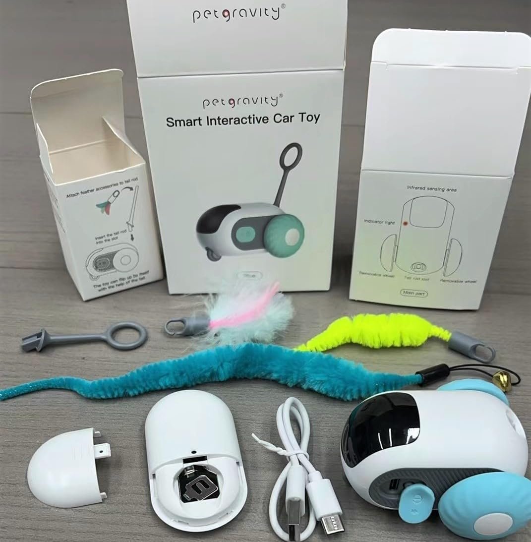 - Una vez abierto, recibirá un paquete exquisito que contiene paquetes pequeños separados. Incluye un carrito azul y blanco que se utiliza principalmente para jugar con los gatos, un cable de carga, un control remoto y, sobre todo, hemos añadido una gran cola azul (con una pequeña campana en la parte superior que atrae la atención de los gatos, algo que nadie más tiene), así como una cola verde y una pequeña cola colorida, un total de tres colas, para ofrecerle una mejor experiencia a cualquier precio.