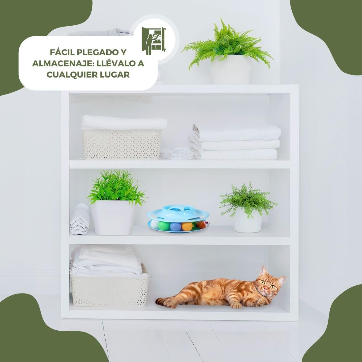 Coloca el juguete en una superficie plana y estable. Deja que el gato interactúe libremente con las pelotas y supervise los primeros usos para que se familiarice.