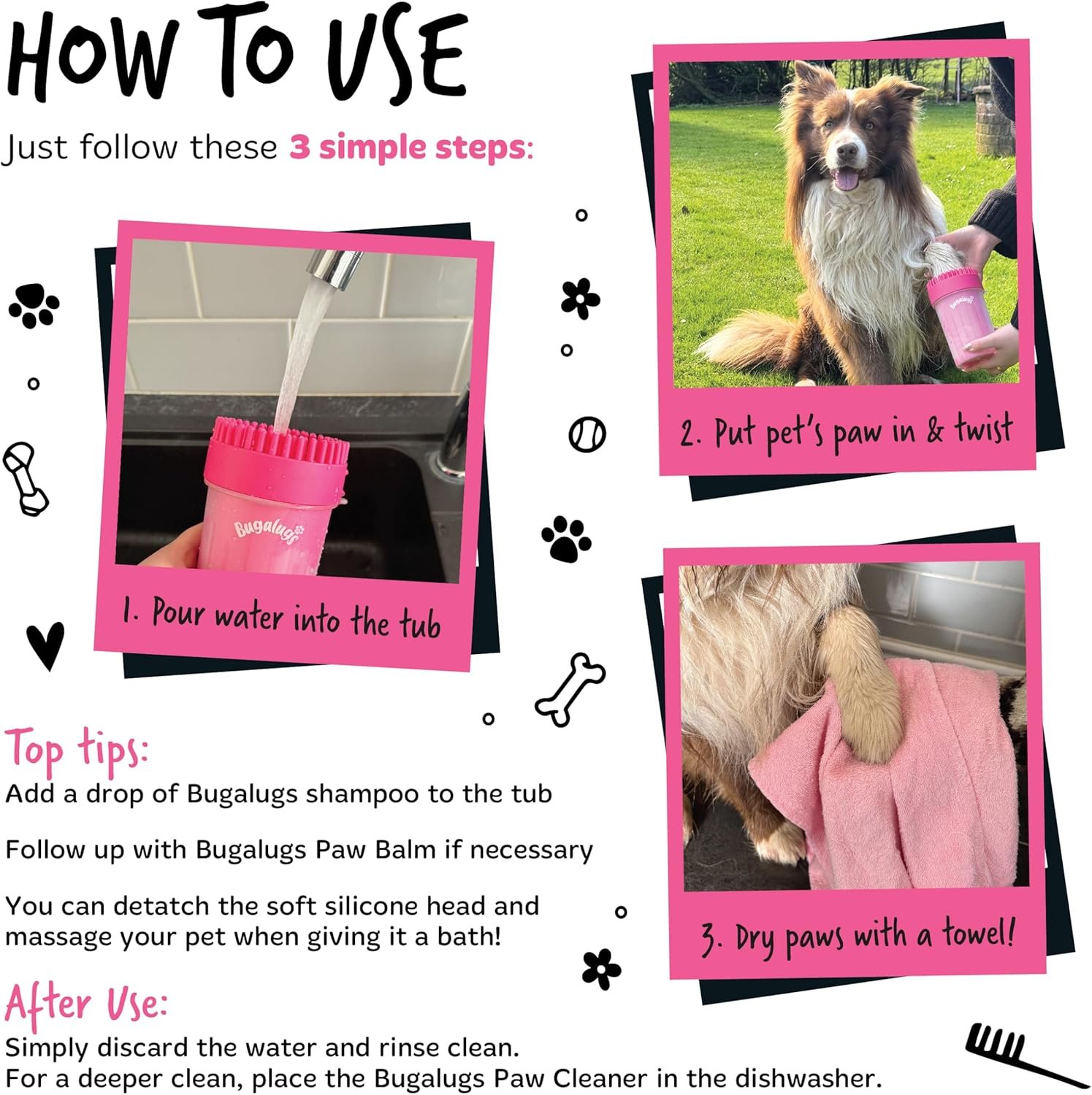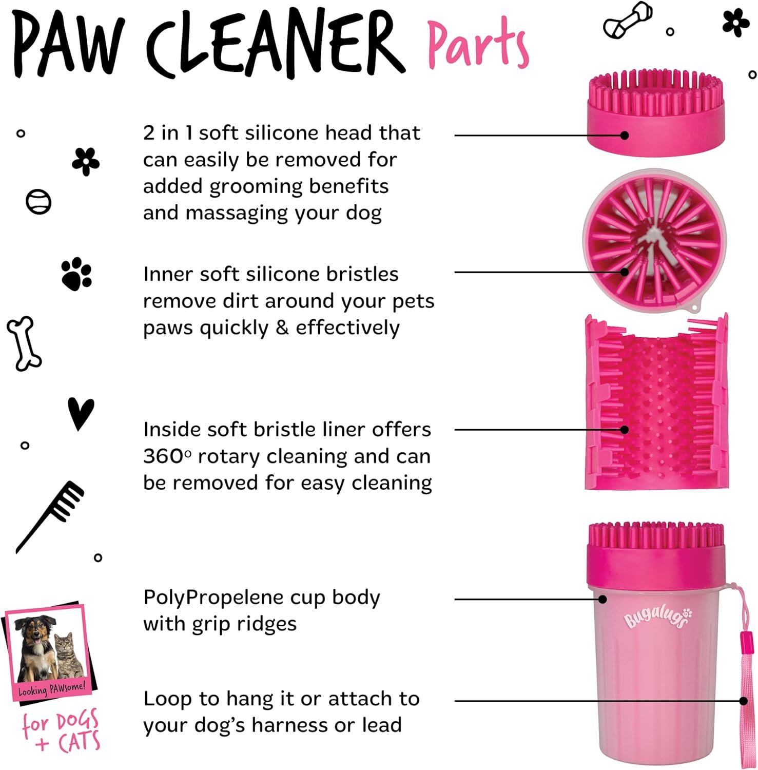 El Limpiador de Patas BUGALUGS es la solución rápida y eficaz para mantener las patas de tu perro limpias y sanas después de cada salida. Diseñado con cepillos de silicona suaves, elimina la suciedad acumulada entre los dedos y las almohadillas sin causar molestias.