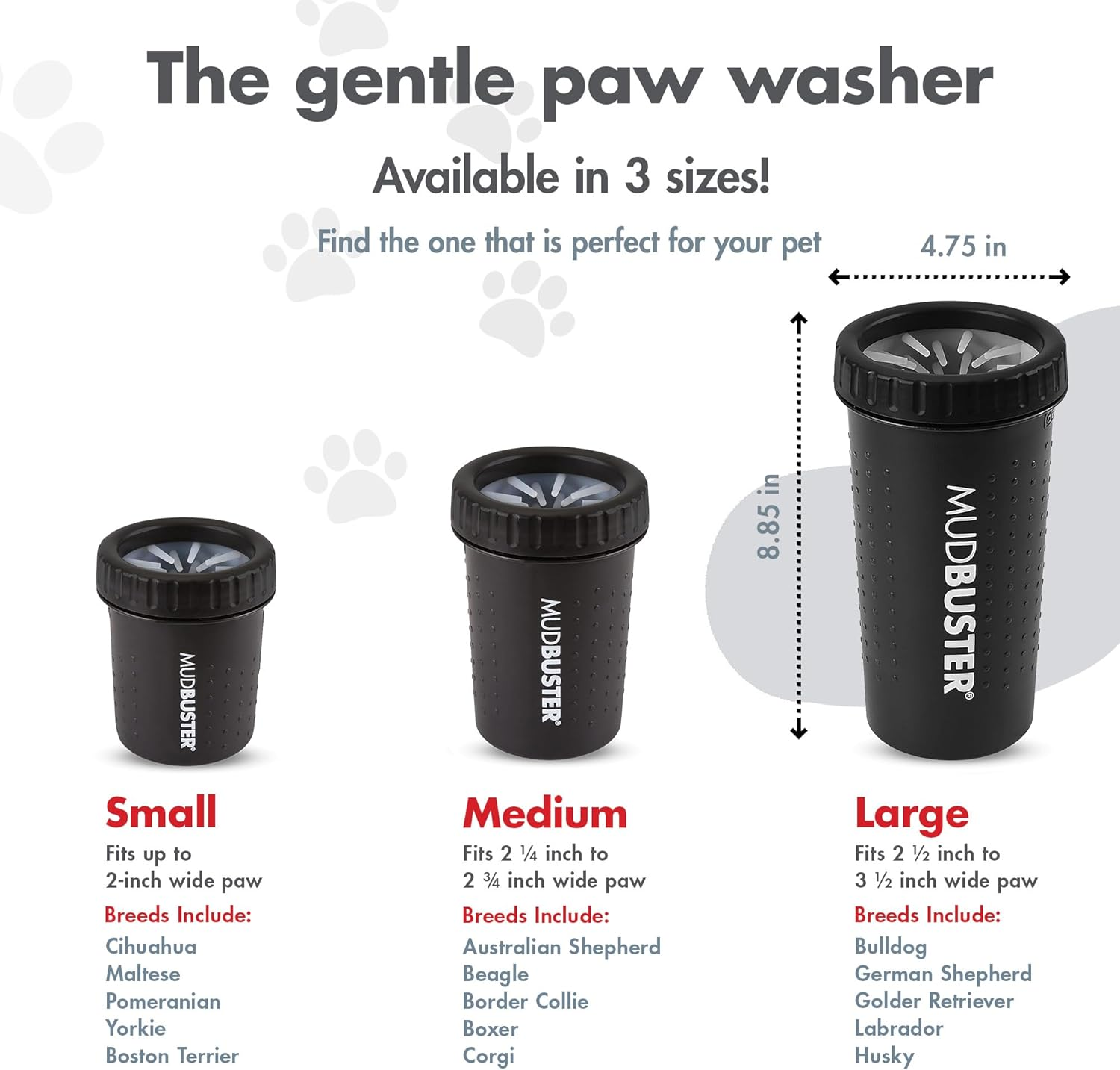- Eficacia y uso adecuado: el MudBuster grande tiene el tamaño perfecto para perros grandes y extragrandes con patas de más de 8,9 cm de ancho. El Mudbuster mide 22 cm de alto y 12 cm de ancho.