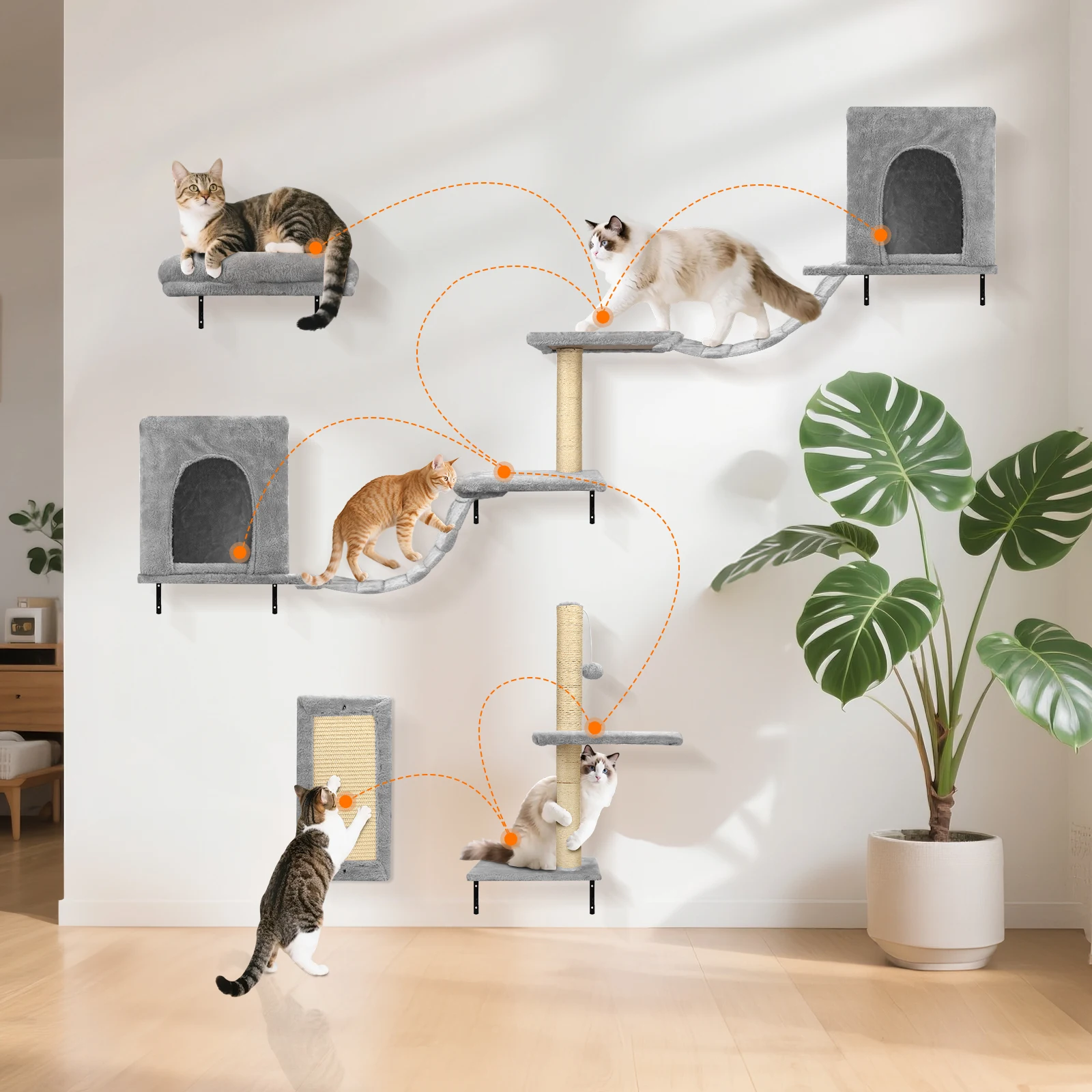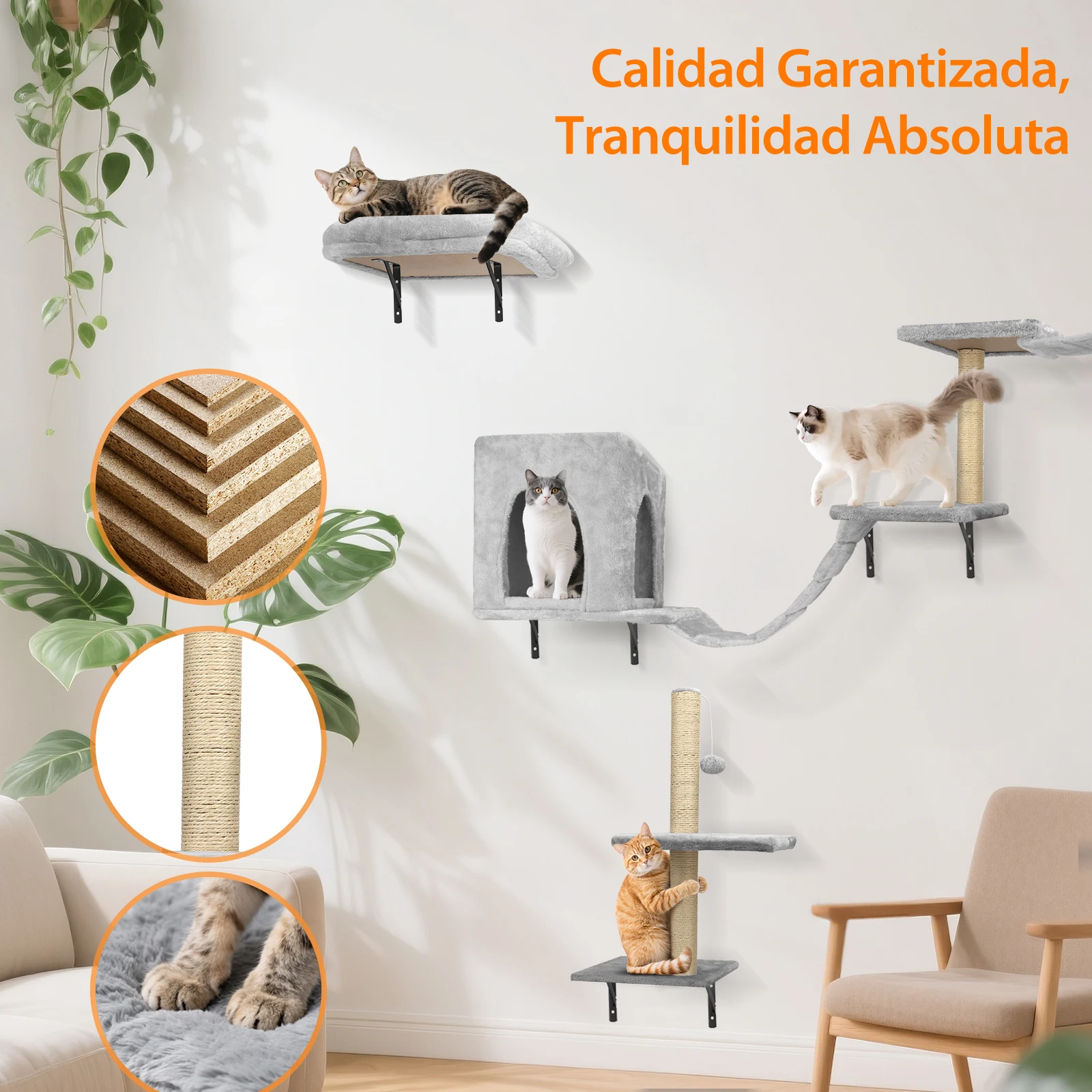 Diseño modular de pared, incluye casitas y puente colgante, rascadores de sisal resistente y enfoque en el enriquecimiento vertical.
