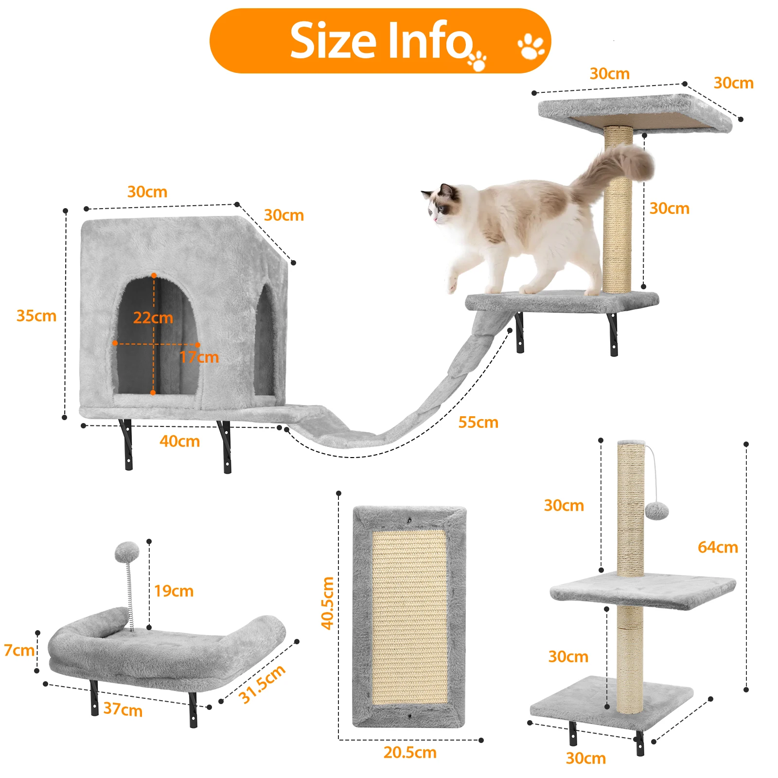 El conjunto incluye dos casitas que ofrecen refugio y descanso, un puente colgante que estimula el equilibrio y el movimiento, además de plataformas fijas y rascadores de sisal que permiten afilar las uñas de forma natural. Todo el sistema se instala en la pared, aprovechando el espacio vertical y liberando superficie en el suelo.