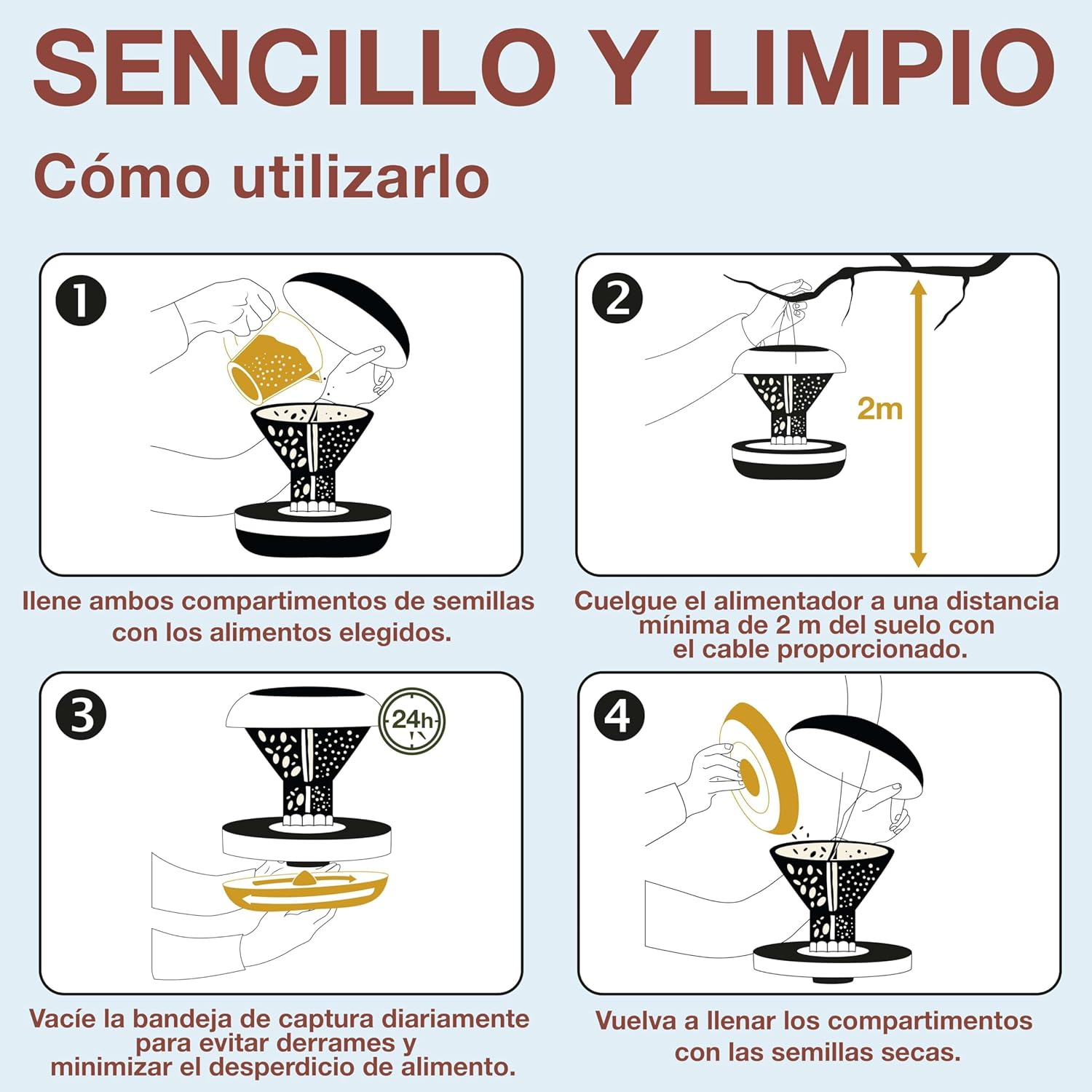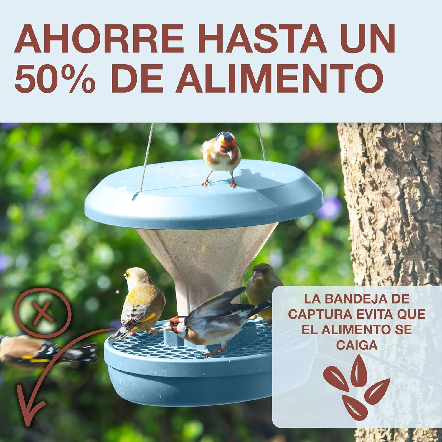 - ♻️ Tolva para Pájaros con Bandeja Colectora: La bandeja inteligente del comedero evita que el alimento caiga al suelo – ahorra hasta un 50% de comida, reduce el desperdicio y permite una alimentación higiénica.