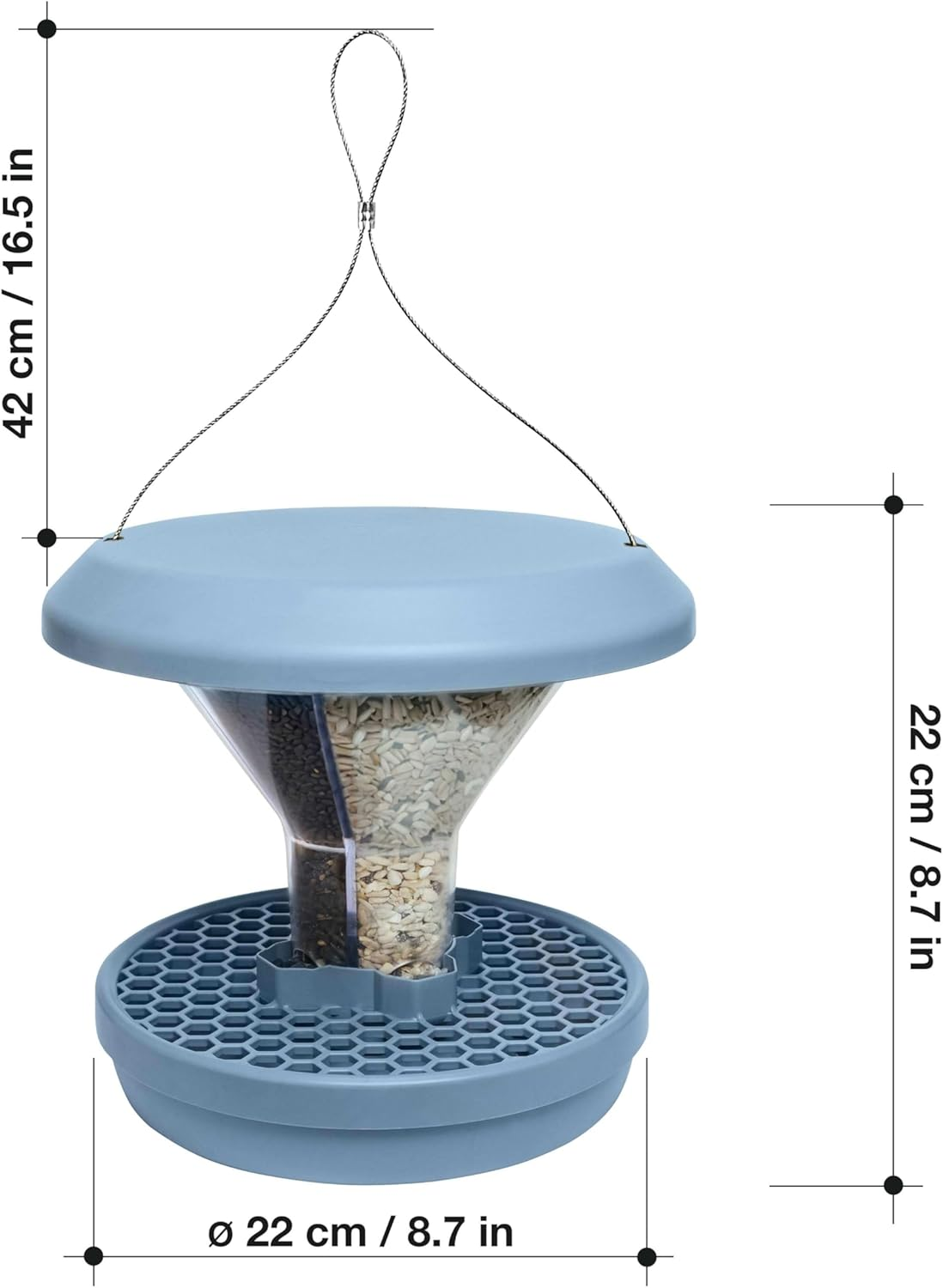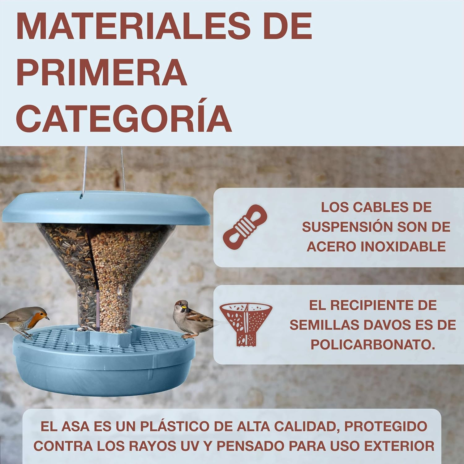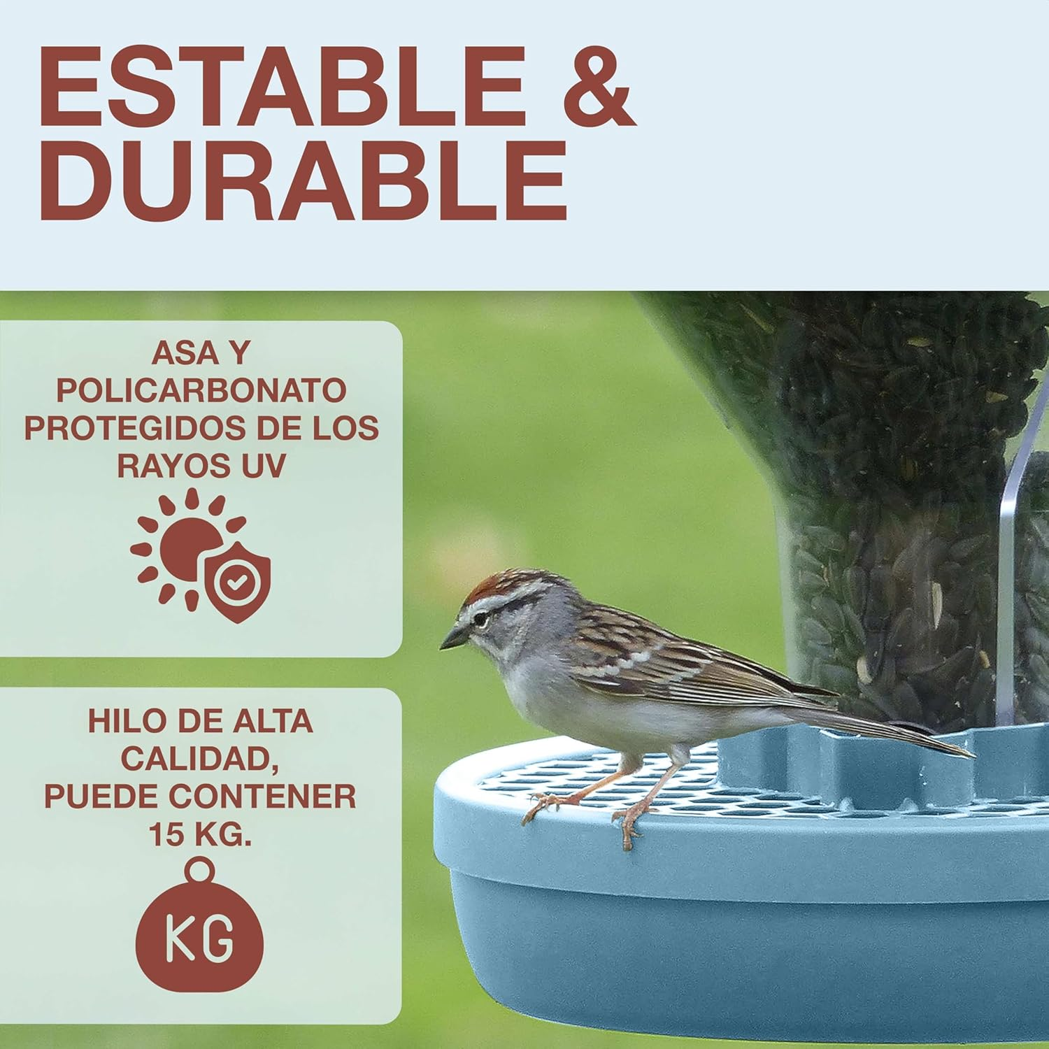 - 🛡️ Dispensador de Comida para Pájaros Resistente a la Intemperie: Plástico ASA con protección UV, contenedor de policarbonato y cable de acero inoxidable para años de uso en todas las estaciones – perfecto como casa para pájaros alimentadora.