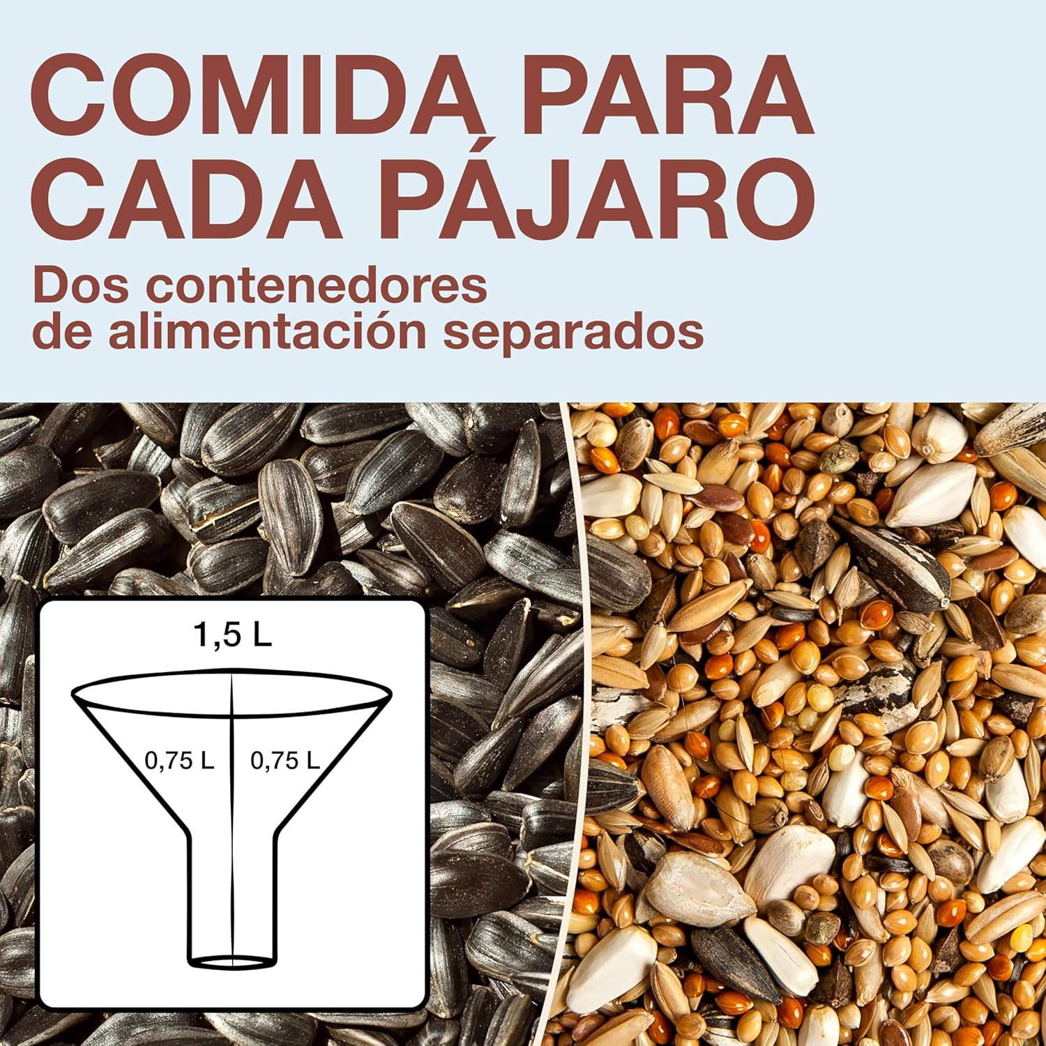 - 🌿 Comedero Colgante con Sistema de Doble Cámara: Dos compartimentos separados permiten ofrecer simultáneamente diferentes tipos de alimento para distintas especies de aves – perfecto como estación de alimentación para aves silvestres.