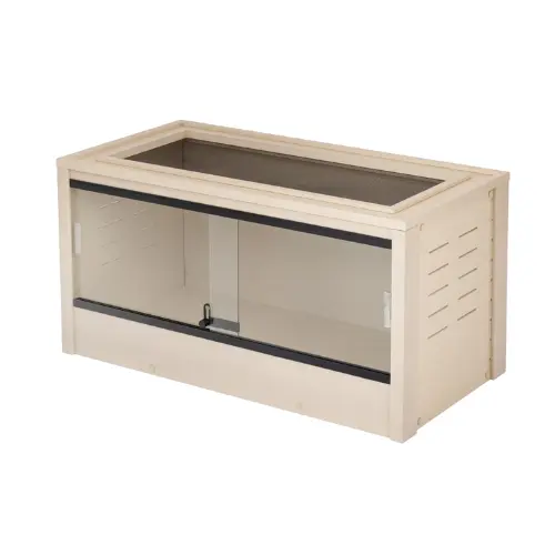 Fabricado con material EcoFlex, combina resistencia, durabilidad y un diseño moderno que se integra fácilmente en el hogar. Sus puertas correderas de cristal facilitan el acceso para la limpieza y la alimentación, mientras que la tapa superior de malla permite una ventilación adecuada y la correcta colocación de sistemas de iluminación o calefacción.