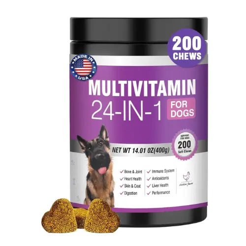 Las Vitaminas y Suplementos para Perros 24-en-1 (200 masticables sabor pollo) apoyan la salud integral diaria de tu perro desde la piel hasta las articulaciones. Su fórmula combina Omega-3, glucosamina, condroitina, MSM, probióticos, DHA y antioxidantes para cuidar piel y pelo, movilidad, digestión, corazón, hígado, cerebro, ojos e inmunidad.